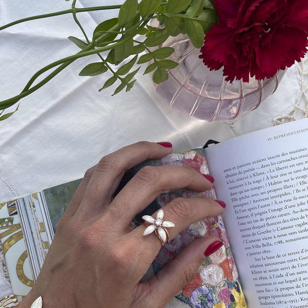 Realizado en Plata de Ley, cuidadosamente chapado en Oro de 18 kt, este anillo destaca por su equilibrio entre la pureza del metal y la calidez del dorado. En el centro, un pequeño destello de luz realza la pieza, mientras que sus pétalos presentan un acabado en esmaltado nacarado, que aporta profundidad, brillo y una textura envolvente que cambia con la luz.