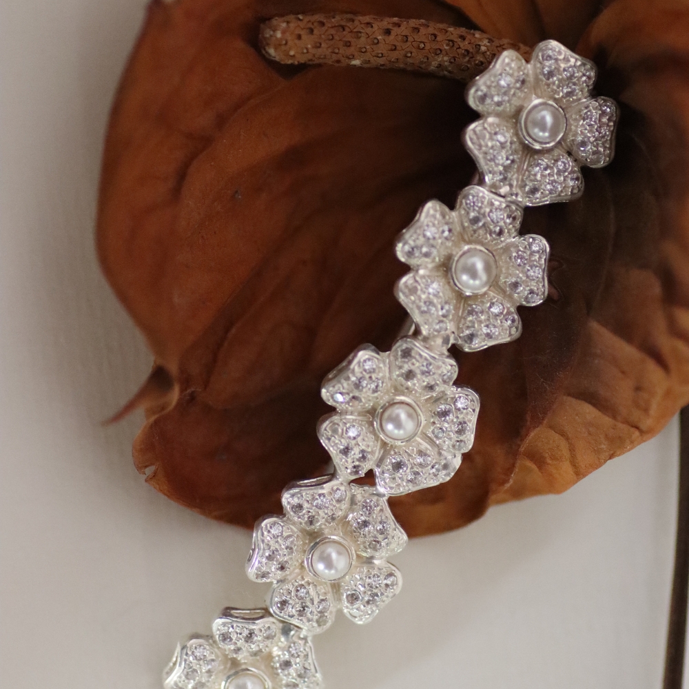 La pieza combina cinco jazmines engastados en pavé, cada uno con una perla central que aporta un contraste sutil y elegante, logrando un diseño atemporal.