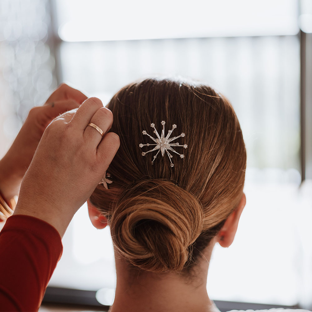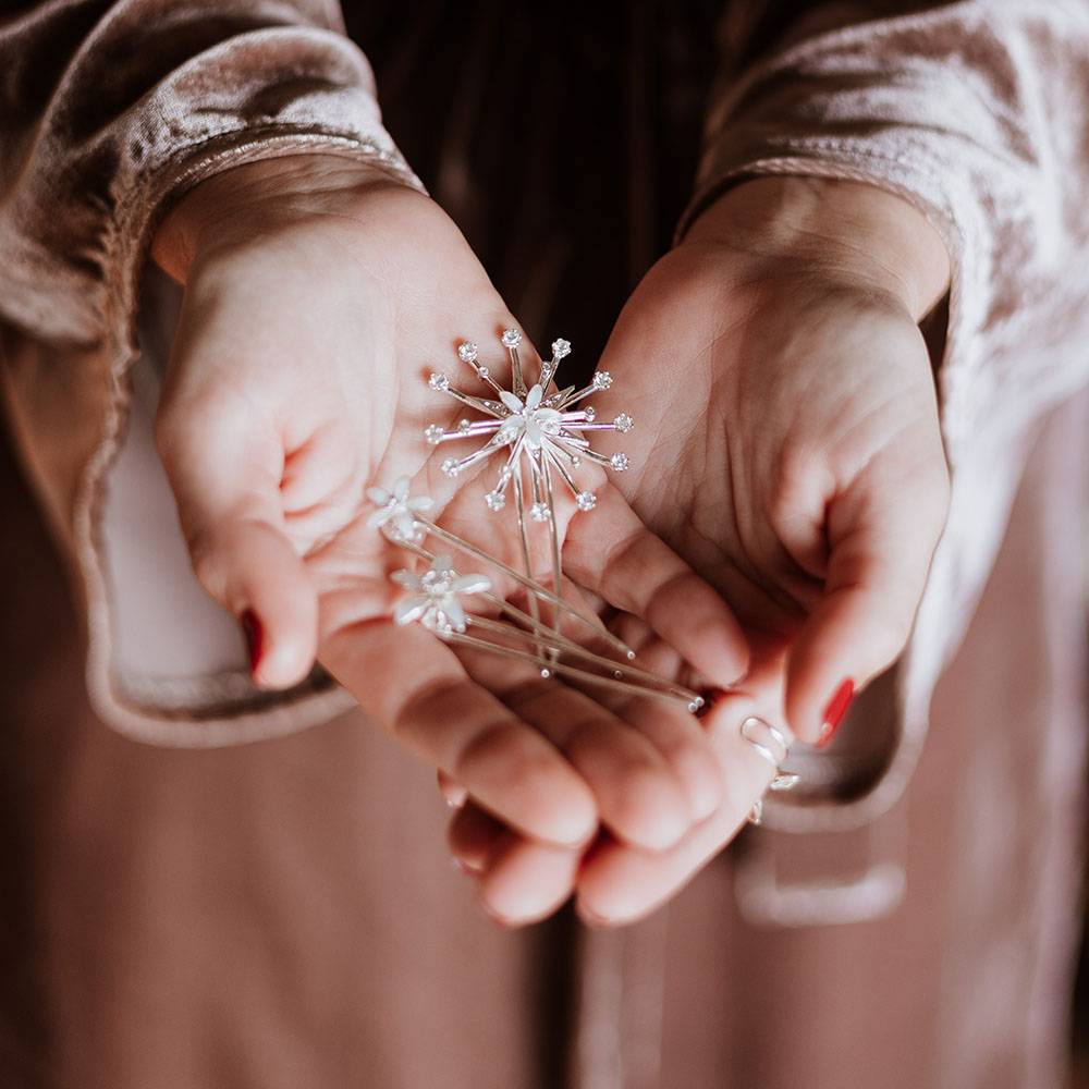 Cada pétalo se esmalta a mano con micropartículas de nácar, aportando un brillo perlado y sutil. El cristal central, de talla brillante, refuerza la sensación de profundidad y resalta la geometría natural de la flor. La disposición asimétrica de los elementos crea un efecto envolvente y equilibrado, perfecto para recoger el cabello con elegancia o destacar en composiciones más amplias.