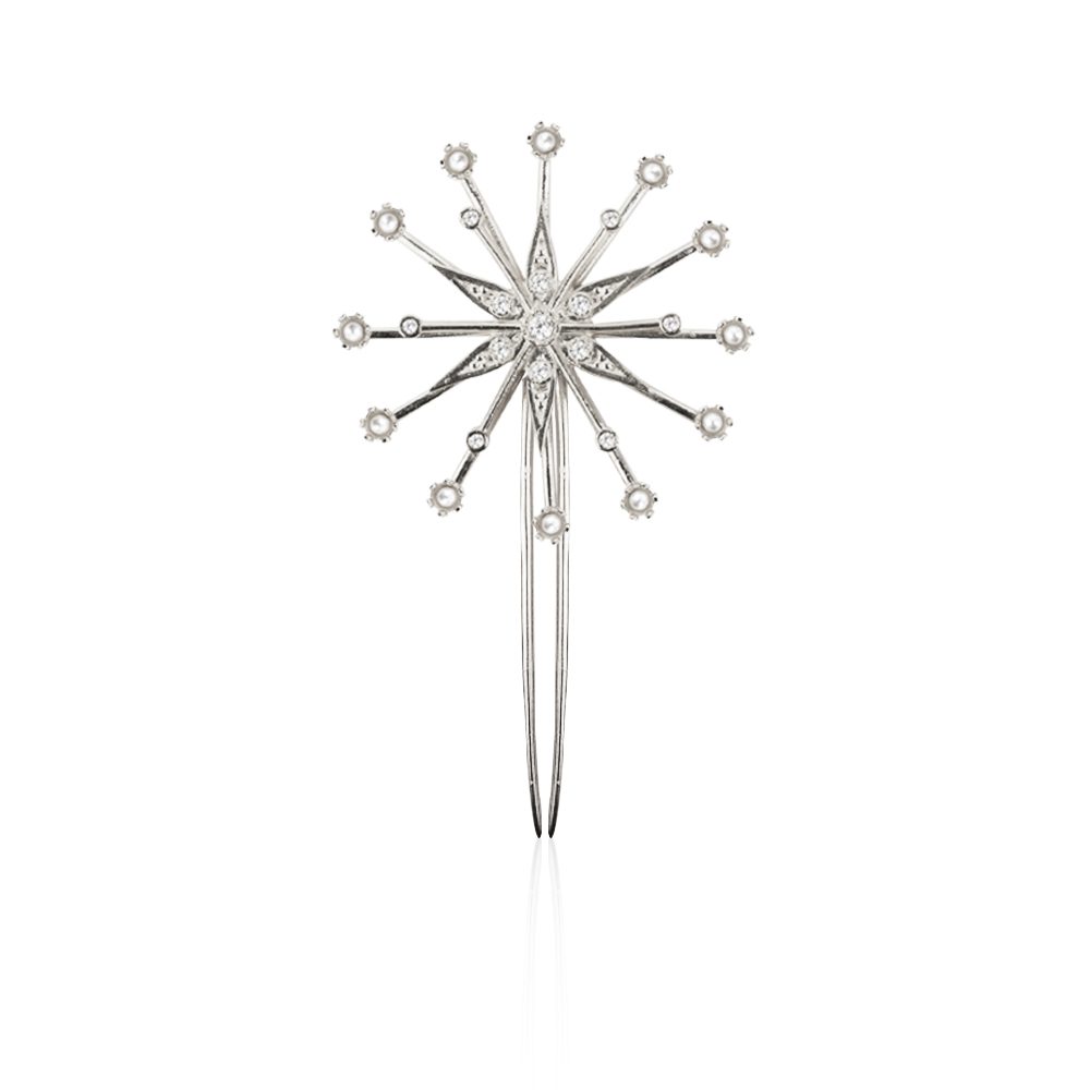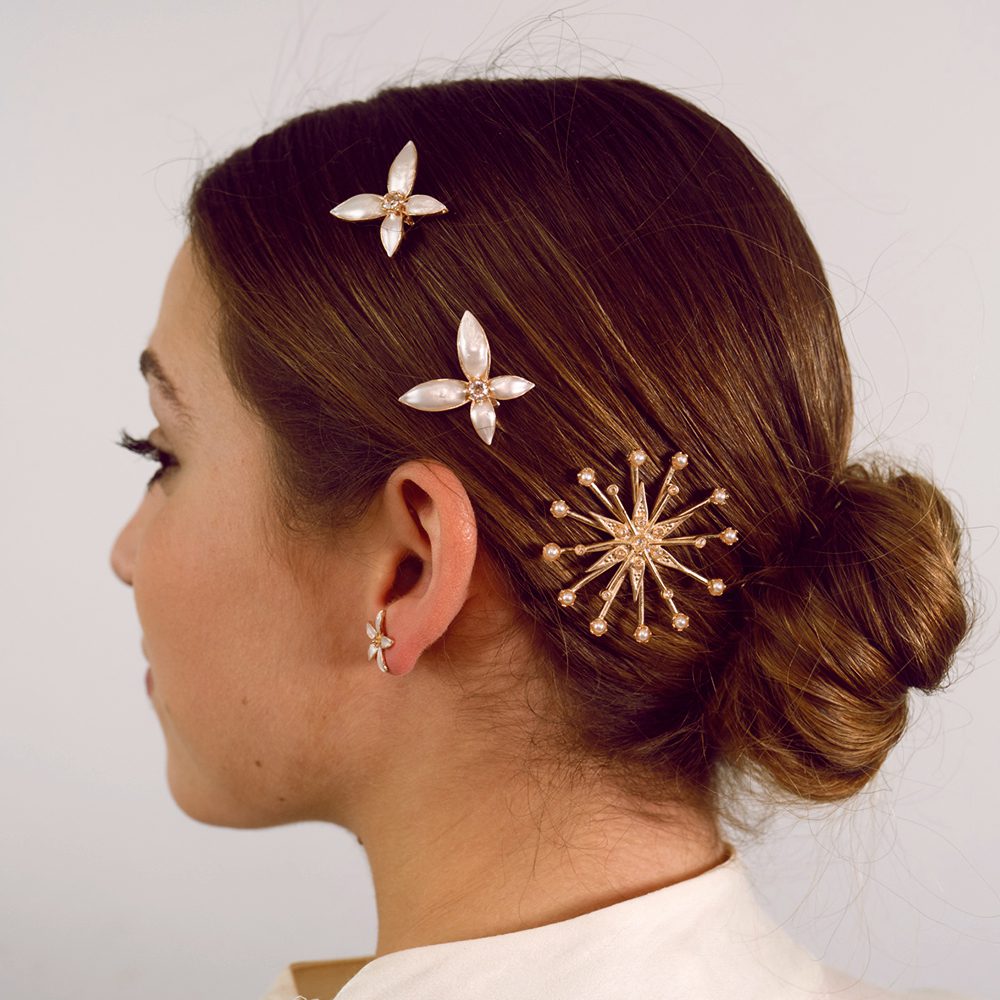 Puede lucirse como pieza protagonista en recogidos, semirrecogidos o trenzas. Así, transforma cualquier peinado en una composición única, equilibrada y muy luminosa. Combínala con otras horquillas de la colección para un resultado aún más espectacular.
