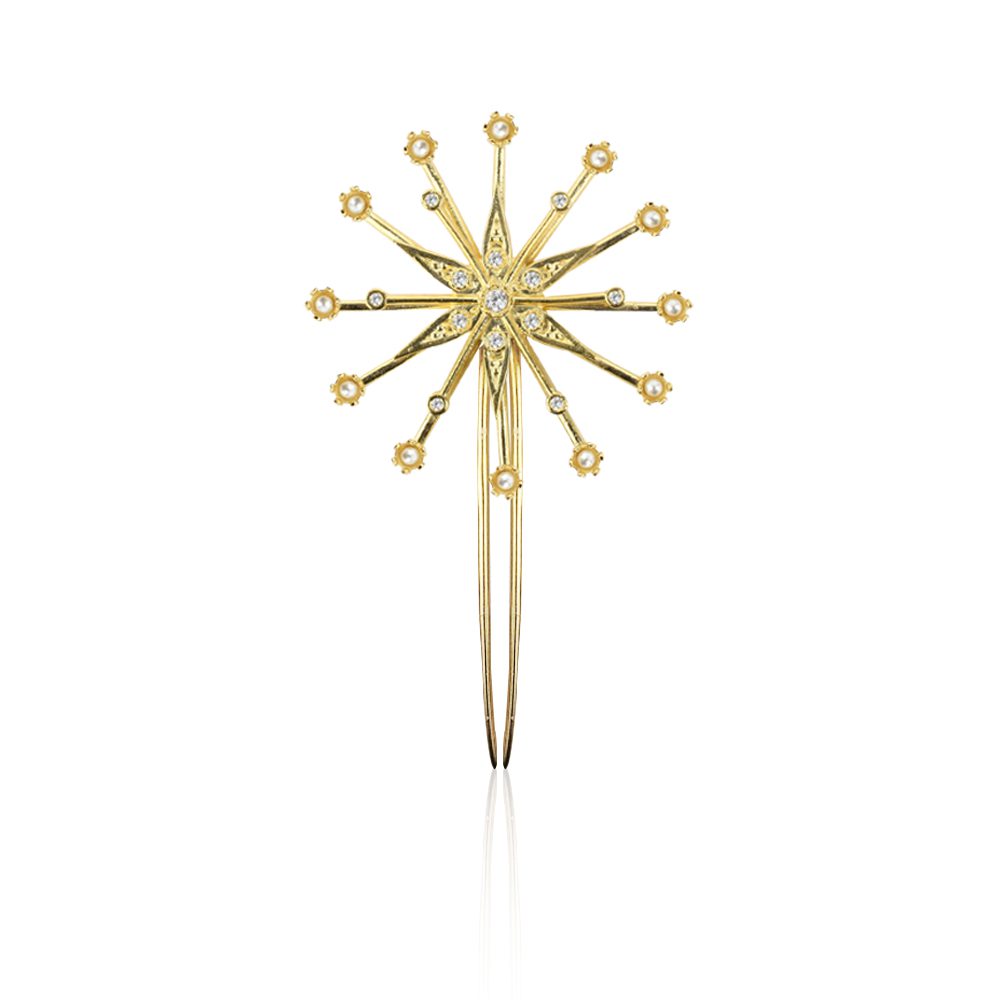 La Horquilla Pelo Joya Estrella de Constelación es una joya para el cabello elaborada a mano en Sevilla. Está inspirada en la armonía del cosmos y en la belleza de las estrellas. Además, su diseño combina delicadas flores y cristales engastados con precisión, creando un efecto luminoso y elegante sobre el cabello.