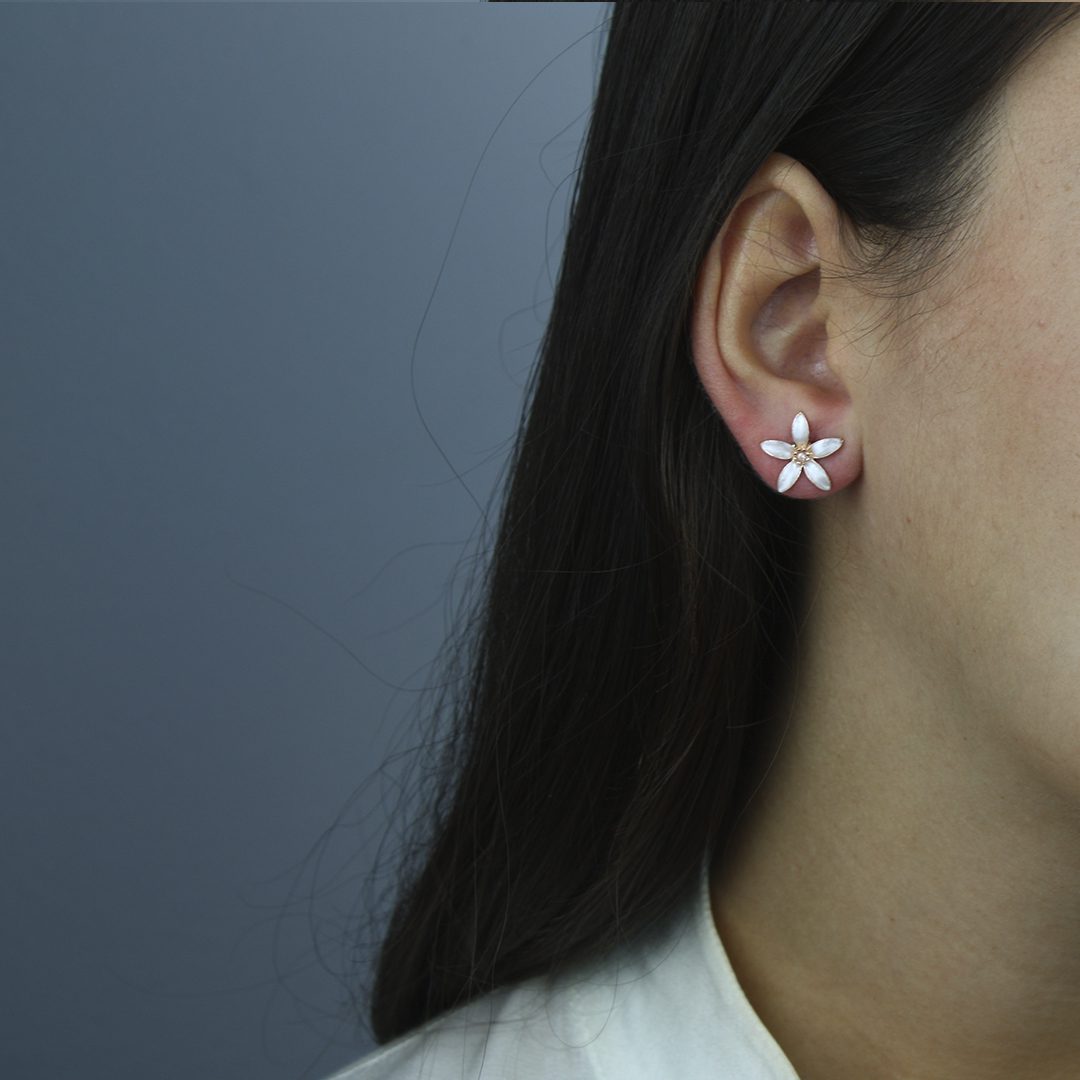 El acabado en esmaltado de fuego nacarado es fruto de un proceso completamente artesanal. Capa a capa, el esmalte se aplica a mano y se somete a un calor preciso que funde los pigmentos y fija el color. El trabajo minucioso de los Pendientes Jazmín Estelar Mini da lugar a una superficie luminosa, con reflejos suaves y cambiantes que evocan la textura del nácar natural.