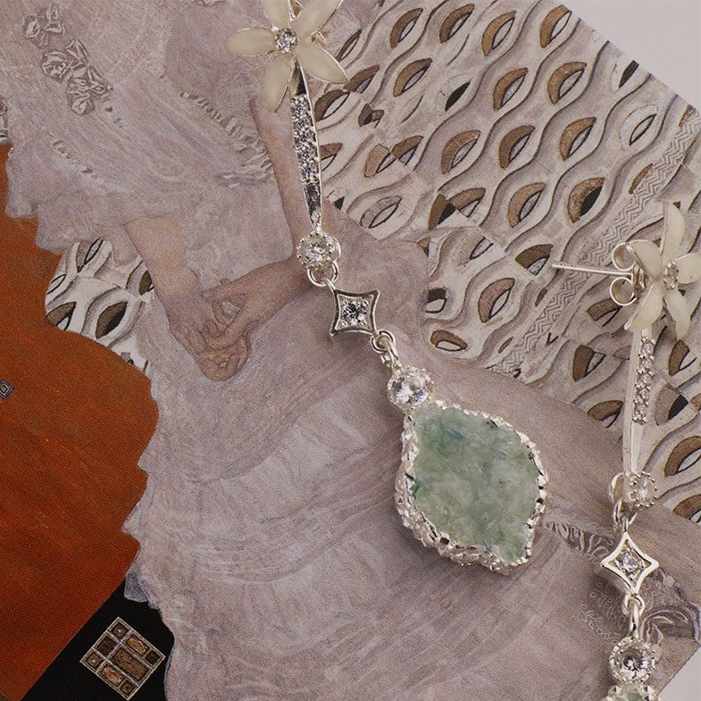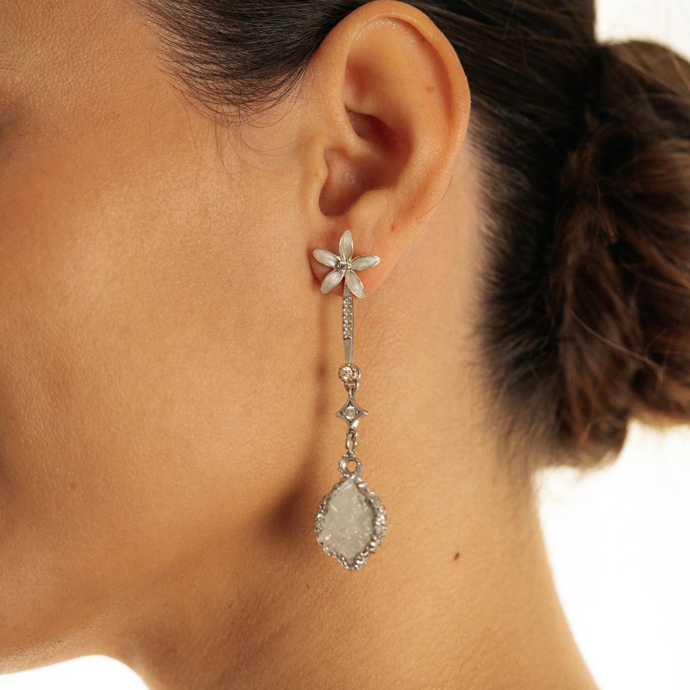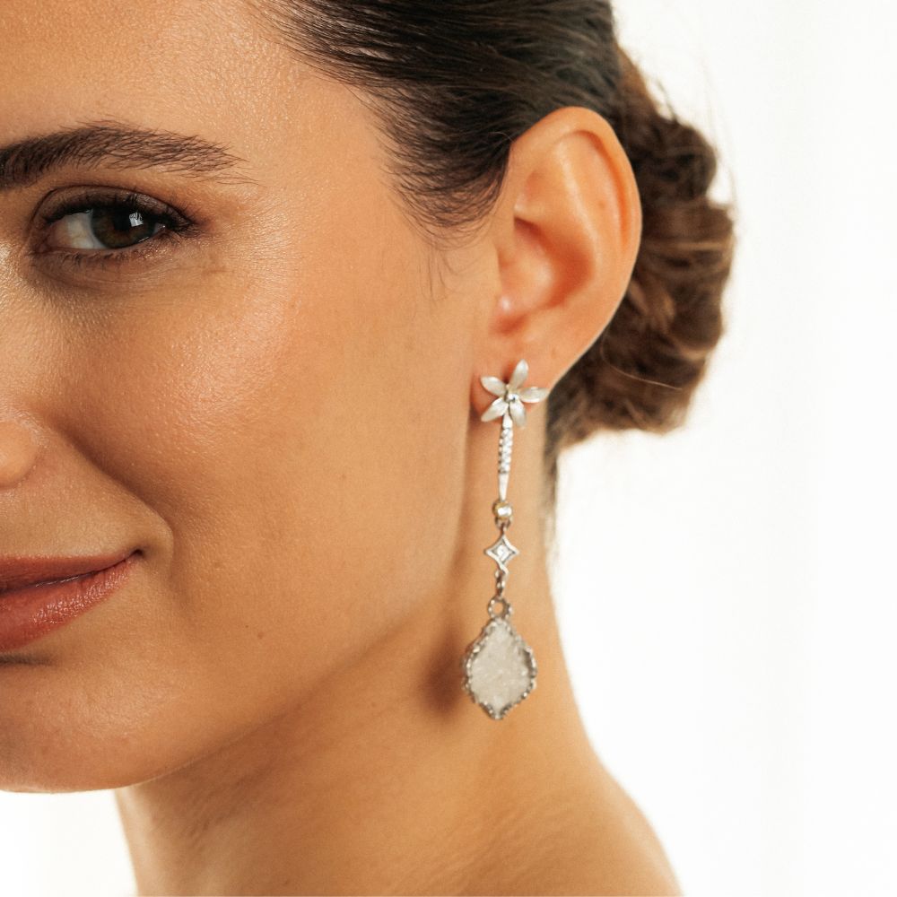 Cada pieza está realizada artesanalmente en Plata de Ley y cuidadosamente engastada con cristales de talla brillante, seleccionados por su pureza y luminosidad. Estos aportan destellos sutiles y refinados que capturan la luz con elegancia en cada movimiento, iluminando el rostro con delicadeza.