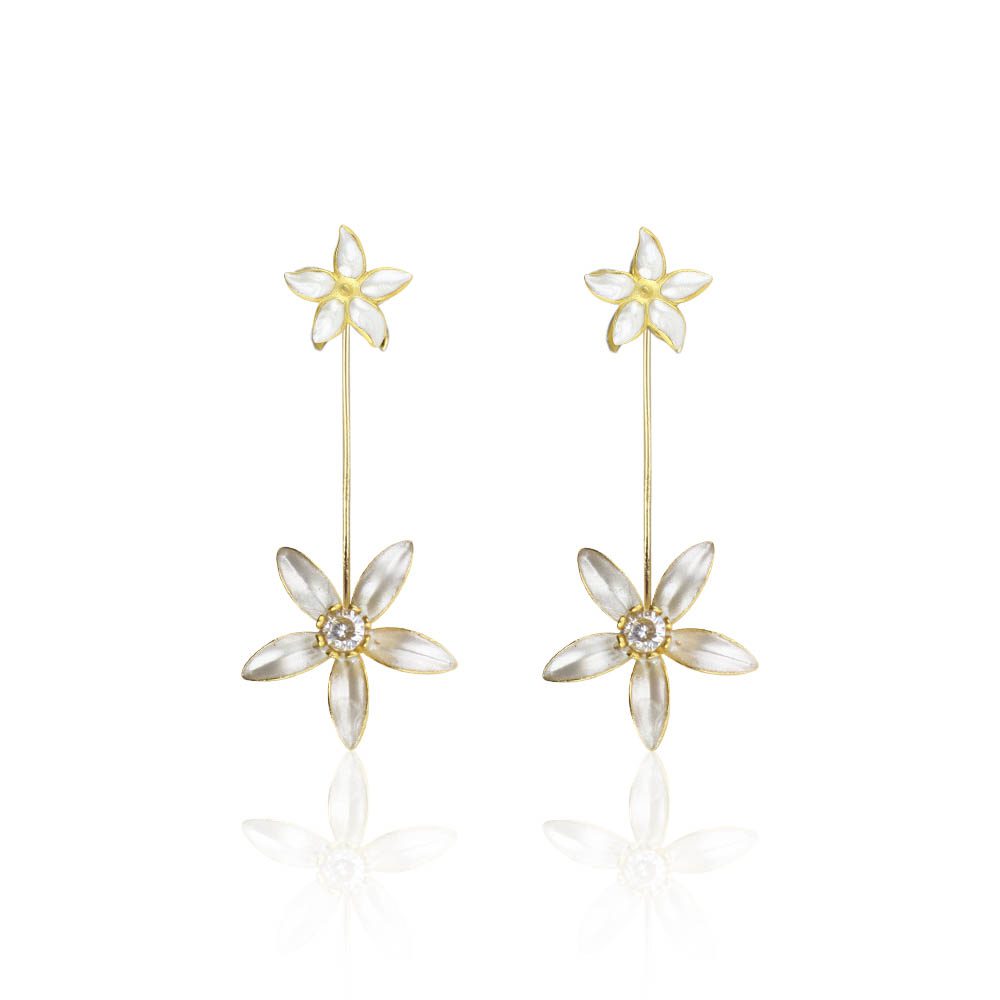 Los pendientes Novia de Perlas y Jazmines reinterpretan la forma del jazmín en un diseño estructurado y vertical. La parte superior está formada por una flor en relieve que aporta volumen y carácter. Le sigue una línea recta con cristales engastados que aportan brillo y ritmo visual, culminando en una perla natural de contorno ovalado.