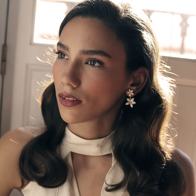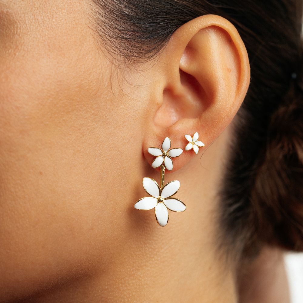 Su diseño desmontable ofrece versatilidad y equilibrio. Puedes lucir solo el jazmín superior para un estilo discreto o añadir el jazmín inferior para un toque más sofisticado. Esta posibilidad de combinación permite adaptar la joya a cada ocasión, desde un look cotidiano hasta un evento especial.