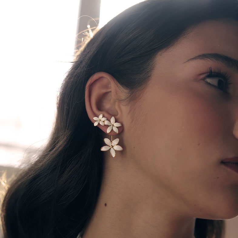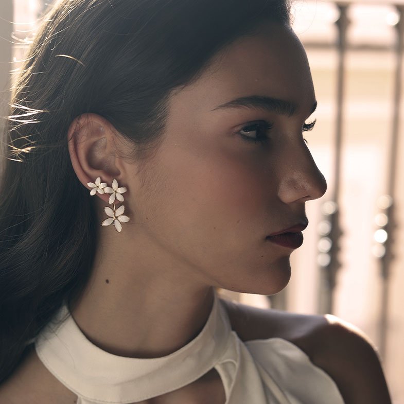 Su diseño desmontable permite jugar con distintas formas de llevarlos: puedes lucir el jazmín superior solo para un estilo discreto y refinado, o incorporar el jazmín inferior para un efecto más sofisticado y escultural. Esta versatilidad permite crear un earlook exclusivo y personal, combinando los distintos tamaños de la Colección Jasmine.