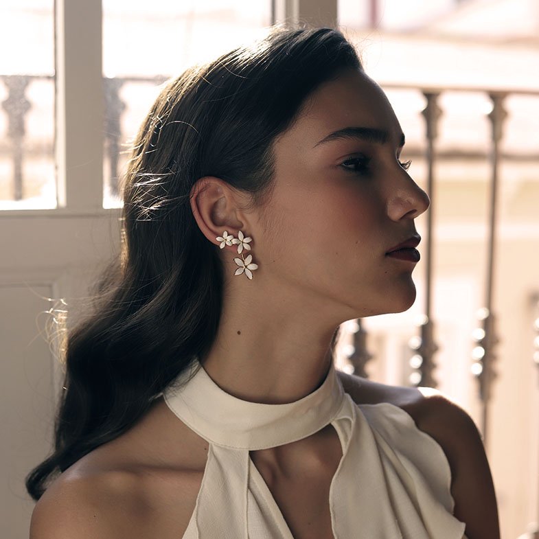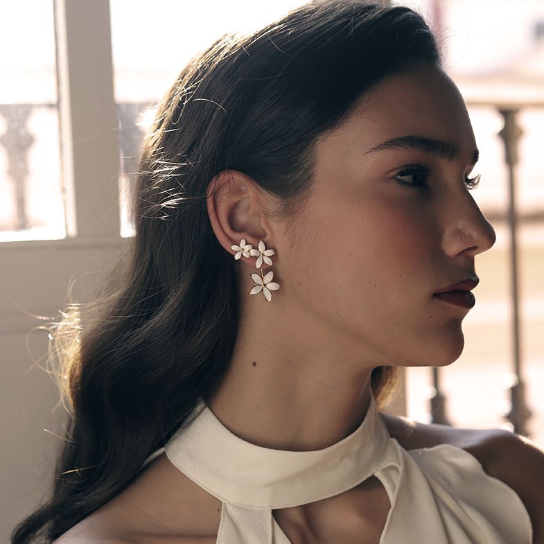 Cada pendiente ha sido cuidadosamente elaborado de manera artesanal, combinando tradición joyera y diseño contemporáneo. Los pétalos presentan un acabado esmaltado blanco que refleja la luz con sutileza, aportando un brillo nacarado lleno de matices. Este detalle artesanal confiere a cada pieza una sensación de vida y frescura, como si la flor acabara de abrirse.