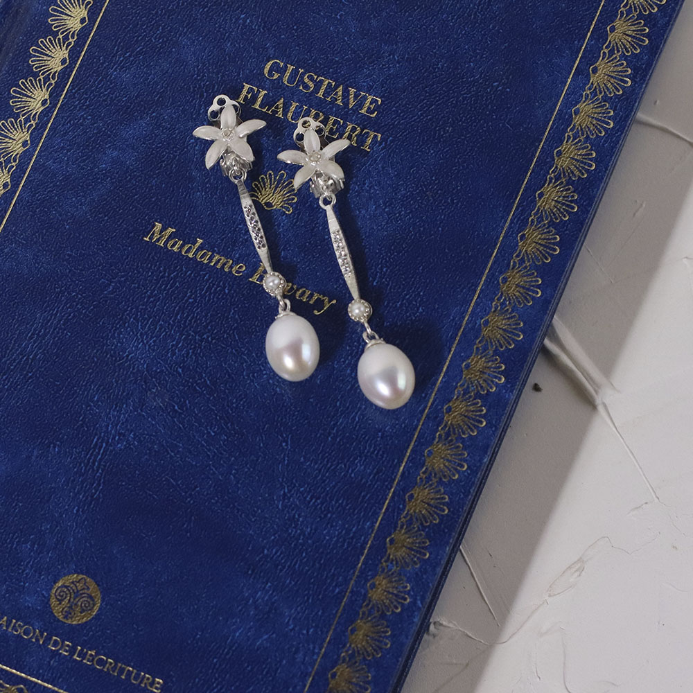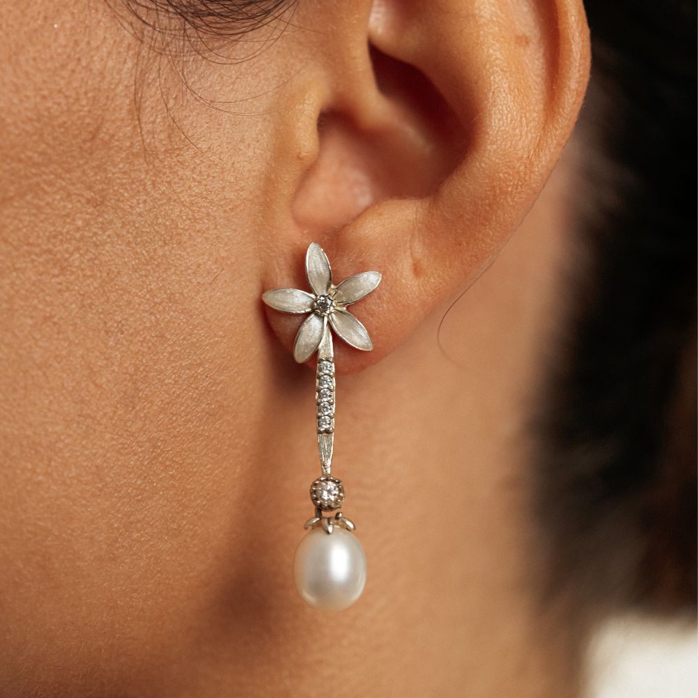 Los Pendientes Novia Perla colgante de Jazmín, están inspirados en la eternidad de los recuerdos. Los Pendientes Perlas y Jazmines están realizados en Plata de Ley con cristales de talla brillante. La perla llena de belleza este diseño tan especial, que evocan los brotes de nardos.