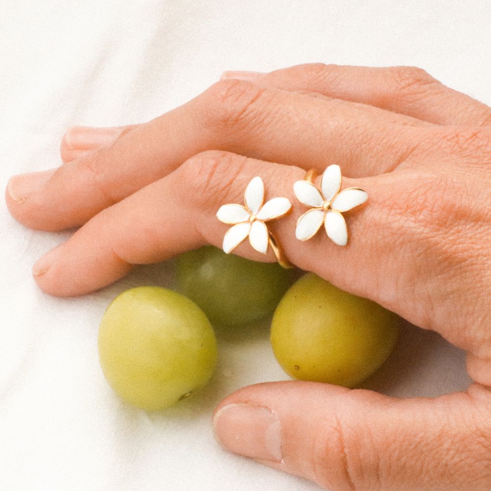 Anillo Jazmín Blossom Double inspirado en los jardines de Monet y todo el misterio que envuelve al amanecer de un nuevo día. Diseño realizado en Plata de Ley, chapado en Oro 18kt. Ideales para completar un look ecléctico y minimalista, aportando un toque sofisticado y cargado de feminidad.
