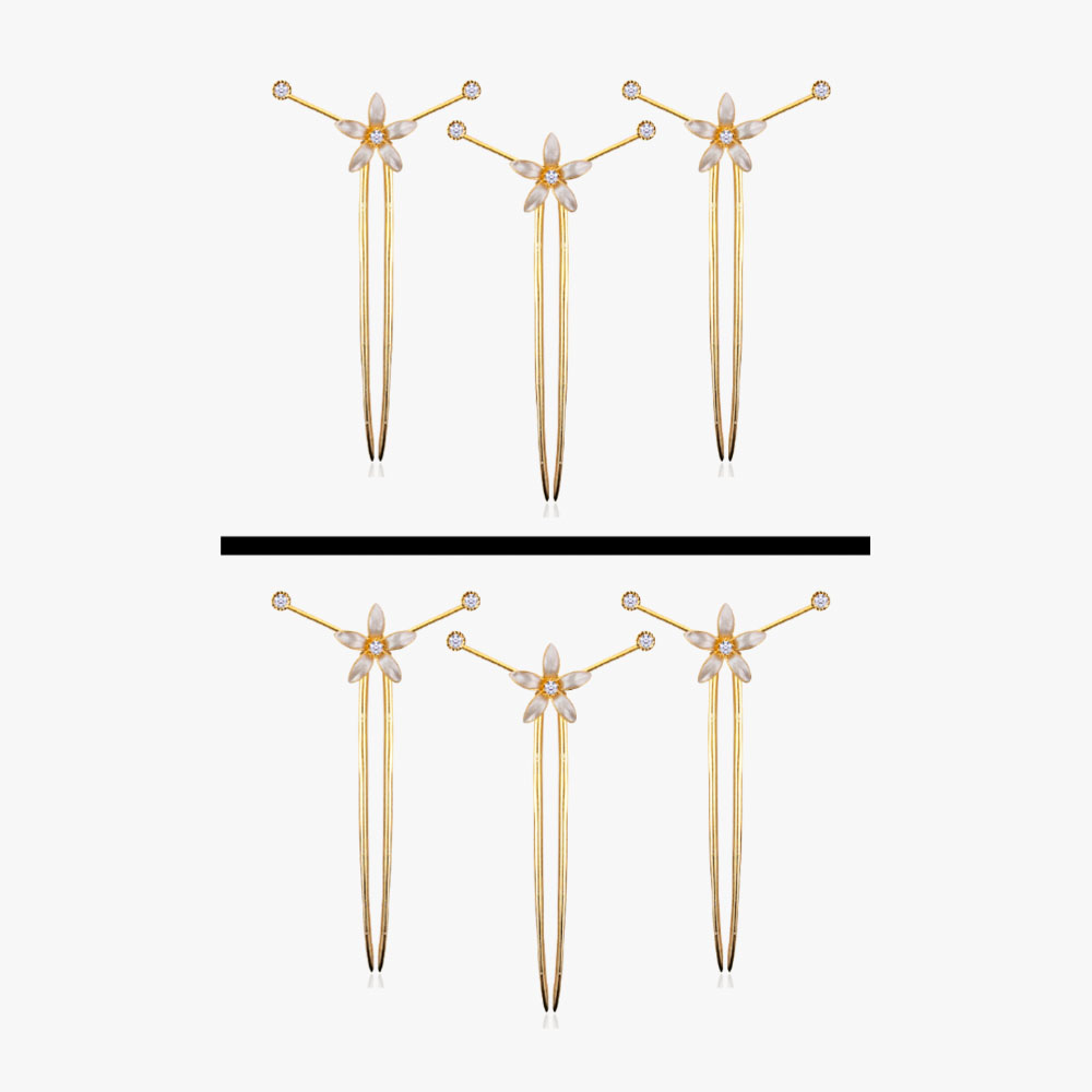 Este conjunto permite construir composiciones delicadas y modernas, perfectas para recogidos pulidos, trenzas o peinados con textura. Las seis horquillas pueden disponerse en línea, dispersas o en forma de constelación, generando una lectura visual armoniosa y llena de movimiento.