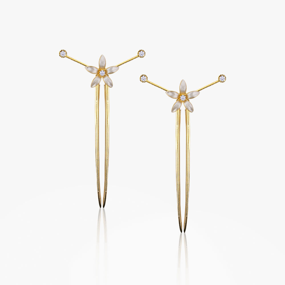 Las horquillas Horquillas Jasmine Milky permiten componer peinados que fluyen como constelaciones: recogidos bajos, trenzas sueltas o semi recogidos con movimiento natural. Cada combinación crea un efecto de luz sutil que acompaña el conjunto con elegancia y coherencia visual.